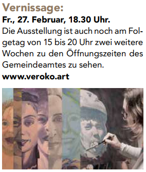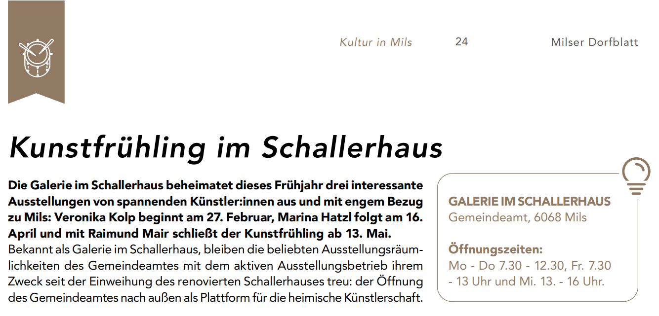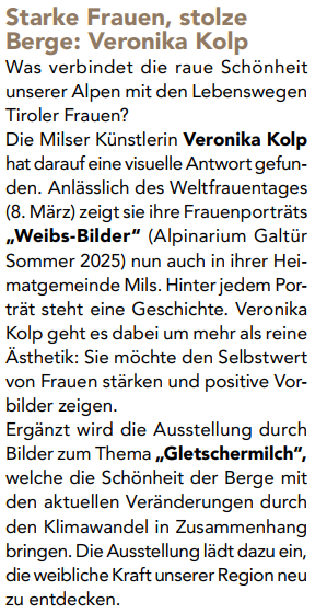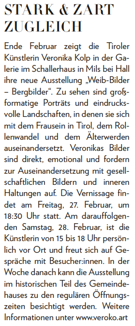 Presse Sammlung von Presse- und Onlineberichten über Veronika Kolp Tirolerin Februar 2026 – Kultur Hallerblatt vom Februar 2026 Mein Mils 2026 / 1 Landeck-TV berichtet von der Eröffnung im Alpinarium am 6.6.2025 20er Nr. 266 Juli/August 2025 von Jakob Häusle Tirolerin Juni 2025 – Kultur Hallerblatt vom 5. Juni 2025 Rundschau vom 19. Mai 2025 von Daniel Haueis Rundschau vom 17. Juni 2025 von Marlen Perl Zillertaler Zeitung: Vernissage KÖPFE vom 26.04.2023 Innsbruck Alpin Ausgabe 4 / 2024